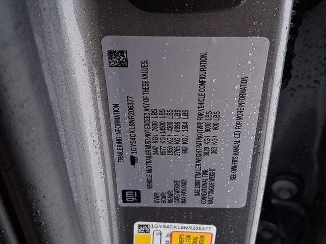 This Vehicle Includes the Following Options: Heavy-Duty Trailering Package (2-Speed Active Transfer Case, Extra Capacity Cooling System, Trailer Tire Pressure Monitoring System, Trailering Assist Guidelines, and Wired Auxiliary Trailer Camera (LPO)), Performance Package (Electronic Limited-Slip Differential, Hitch Guidance w/Hitch View, Integrated Trailer Brake Controller, Magnetic Ride Control Suspension, Smart Trailer Integration Indicator, and Trailer Side Blind Zone Alert), Preferred Equipment Group 1SB (Adaptive Cruise Control, AKG Studio 19-Speaker Audio System, Automatic Seat Belt Tightening, Automatic Stop/Start, Door Lock & Latch Shields, Enhanced Automatic Emergency Braking, Enhanced Automatic Parking Assist, Glass Breakage Sensor, Lane Change Alert w/Side Blind Zone Alert, Mechanical Limited-Slip Differential, Power Panoramic Tilt-Sliding Sunroof, Rear Camera Mirror, Rear Camera Mirror Washer, Rear Cross Traffic Alert, Reconfigurable Full-Color Head-Up Display, Reverse Automatic Braking, Running Board Assist Steps, Start/Stop System Disable Button, Theft-Deterrent Alarm System, Vehicle Inclination Sensor, and Vehicle Interior Movement Sensor), Touring Package (Air Ride Adaptive Suspension, Illuminating Front & Rear Sill Plates, and Soft Closing Front & Rear Doors), 4WD, Parchment W/Jet Black Accents Leather, 16.9 Diagonal OLED Infotainment Screen, 19 Speakers, 2-Presets Memory For Driver Seat Adjuster, 3.23 Axle Ratio, 3rd row seats: split-bench, 4-Wheel Disc Brakes, 8-Way Power Driver Seat Adjuster, 8-Way Power Front Passenger Seat Adjuster, ABS brakes, Air Conditioning, AKG Studio Reference 36-Speaker Audio System, Alloy wheels, AM/FM radio: SiriusXM with 360L, Apple CarPlay/Android Auto, Audio memory, Auto High-beam Headlights, Auto tilt-away steering wheel, Auto-dimming door mirrors, Auto-dimming Rear-View mirror, Automatic temperature control, Brake assist, Bumpers: body-color, Compass, Delay-off headlights, Driver door bin, Driver vanity mirror, Dual front impact airbags, Dual front side impact airbags, Electronic Stability Control, Emergency communication system: OnStar and Cadillac connected services capable, Four wheel independent suspension, Front anti-roll bar, Front Bucket Seats, Front Center Armrest w/Storage, Front dual zone A/C, Front reading lights, Fully automatic headlights, Garage door transmitter, HD Radio, Heads-Up Display, Heated & Ventilated Driver & Front Passenger Seats, Heated door mirrors, Heated Driver & Front Passenger Seats, Heated front seats, Heated rear seats, Heated steering wheel, Illuminated entry, Leather Seating Surfaces w/Mini-Chevron Perf Inserts, Leather steering wheel, Low tire pressure warning, Memory seat, Navigation System, Night Vision, Not Equipped w/4-Way Driver & Fr Pass Pwr Lumbar, Not Equipped w/Steering Column Lock, Occupant sensing airbag, Outside temperature display, Overhead airbag, Overhead console, Panic alarm, Passenger door bin, Passenger vanity mirror, Power door mirrors, Power driver seat, Power Liftgate, Power moonroof, Power passenger seat, Power steering, Power windows, Power-Retractable Assist Steps, Premium Smooth Ride Suspension, Radio data system, Radio: AM/FM/SiriusXM w/Navigation, Rain sensing wipers, Rear air conditioning, Rear anti-roll bar, Rear reading lights, Rear window defroster, Rear window wiper, Remote keyless entry, Roof rack: rails only, Security system, SiriusXM w/360L, Speed control, Split folding rear seat, Spoiler, Steering wheel memory, Steering wheel mounted audio controls, Super Cruise, Tachometer, Teen Driver, Telescoping steering wheel, Tilt steering wheel, Traction control, Trip computer, Turn signal indicator mirrors, Variably intermittent wipers, Ventilated front seats, Voltmeter, Wheels: 22 14-Spoke Alloy w/Polished Finish, and Wireless Apple CarPlay/Wireless Android Auto.