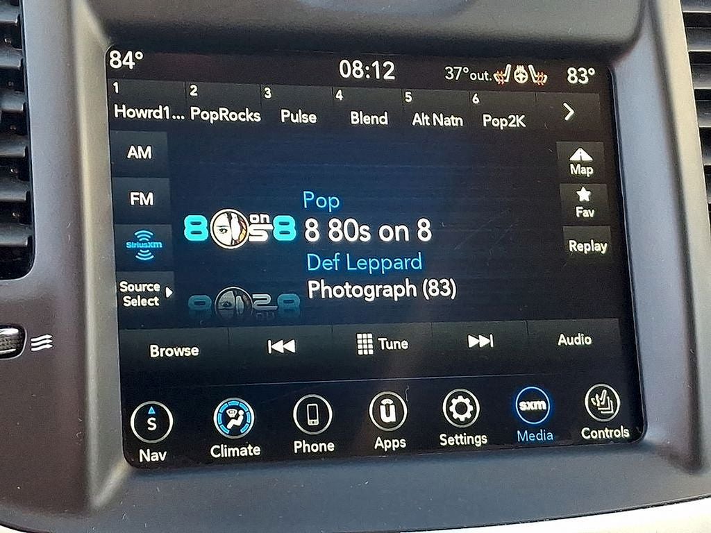THIS VEHICLE INCLUDES THE FOLLOWING FEATURES AND OPTIONS: 1-Yr SiriusXM Guardian Trial, 2-Piece Shark Fin Antenna, 4-Wheel Disc Brakes, 4G LTE Wi-Fi Hot Spot, 6 Speakers, 8.4 Touchscreen Display, ABS brakes, Air Conditioning, Alloy wheels, AM/FM radio: SiriusXM, Anti-whiplash front head restraints, Apple CarPlay, Apple CarPlay/Android Auto, Auto-dimming door mirrors, Auto-dimming Rear-View mirror, Automatic temperature control, Blind Spot & Cross Path Detection, Body Color Exterior Mirrors, Brake assist, Bumpers: body-color, Compass, Delay-off headlights, Driver door bin, Driver vanity mirror, Dual front impact airbags, Dual front side impact airbags, Electronic Stability Control, Emergency communication system: SiriusXM Guardian, Exterior Mirrors Courtesy Lamps, Exterior Mirrors w/Heating Element, Exterior Mirrors w/Supplemental Signals, For Details, Visit DriveUconnect.com, For More Info, Call 800-643-2112, Four wheel independent suspension, Front anti-roll bar, Front Bucket Seats, Front Center Armrest, Front dual zone A/C, Front fog lights, Front reading lights, Fully automatic headlights, Garage door transmitter, Google Android Auto, GPS Antenna Input, HD Radio, Heated door mirrors, Heated Front Seats, Heated front seats, Illuminated entry, Integrated Center Stack Radio, Integrated Voice Command w/Bluetooth®, Knee airbag, Leather steering wheel, Leather Trimmed Bucket Seats, Low tire pressure warning, Media Hub (2 USB, AUX), Occupant sensing airbag, Outside temperature display, Overhead airbag, Overhead console, Panic alarm, ParkView Rear Back-Up Camera, Passenger door bin, Passenger vanity mirror, Power 2-Way Driver Lumbar Adjust, Power 2-Way Passenger Lumbar Adjust, Power door mirrors, Power driver seat, Power Front Driver/Passenger Seats, Power passenger seat, Power steering, Power windows, Radio data system, Radio: Uconnect 4C w/8.4 Display, Rear anti-roll bar, Rear Armrest w/Cupholder Seat, Rear reading lights, Rear seat center armrest, Rear window defroster, Remote keyless entry, Security system, SiriusXM Radio Service, SiriusXM Satellite Radio, Speed control, Speed-sensing steering, Split folding rear seat, Steering wheel mounted audio controls, Tachometer, Telescoping steering wheel, Tilt steering wheel, Traction control, Trip computer, Turn signal indicator mirrors, USB Host Flip, Variably intermittent wipers, and Wheels: 19 x 7.5 Black Noise Painted. 18/27 City/Highway MPG