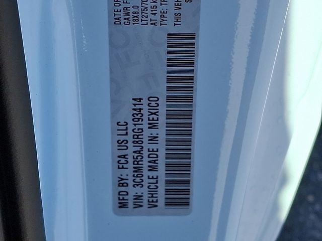 This Vehicle Includes the Following Options: Chrome Appearance Group (Bright Front Bumper, Bright Rear Bumper, Center Hub, Chrome Grille Surround, Chrome Headlamp Bezels, Matte Black Mesh w/Chrome Grille, and Wheels: 18 x 8.0 Steel Chrome Clad), Heavy Duty Snow Plow Prep Group, Quick Order Package 2GA Tradesman, Tradesman Level 1 Equipment Group (Black Exterior Mirrors, Exterior Mirrors Courtesy Lamps, Exterior Mirrors w/Heating Element, Exterior Mirrors w/Supplemental Signals, Front 1-Touch Down Power Windows, Manual Folding Exterior Mirrors, Manual Telescoping Mirrors, Mirror Running Lights, Overhead Console, Overhead Cupholder Lamp, Power Adjust Mirrors, Power Heated Folding Telescopic Mirrors, Power-Adjustable Convex Aux Mirrors, Remote Keyless Entry, Speed Sensitive Power Locks, and Upgraded Door Trim Panel), 17 x 7.5 Steel Styled Wheels, 2-Way Front Head Restraints, 220 Amp Alternator, 3.73 Axle Ratio, 4 Speakers, 4-Wheel Disc Brakes, 40/20/40 Split Bench Seat, ABS brakes, Air Conditioning, AM/FM radio, Brake assist, Compass, Delay-off headlights, Driver door bin, Dual front impact airbags, Dual front side impact airbags, Electronic Stability Control, Electronically Controlled Throttle, Emergency communication system: SiriusXM Guardian, For Details, Visit DriveUconnect.com, Front anti-roll bar, Front Armrest w/Cupholders, Front Center Armrest w/Storage, Front License Plate Bracket, Front reading lights, Fully automatic headlights, Global Telematics Box Module (TBM), GPS Antenna Input, Heavy Duty Vinyl 40/20/40 Split Bench Seat, I/P Mounted Auxiliary Switches, Illuminated entry, Integrated Voice Command w/Bluetooth®, Low tire pressure warning, Manual Adjust 4-Way Driver Seat, Manual Adjust 4-Way Front Passenger Seat, Occupant sensing airbag, Outside temperature display, Overhead airbag, ParkView Rear Back-Up Camera, Passenger door bin, Passenger vanity mirror, Power steering, Radio data system, Radio: Uconnect 3 w/5 Display, Rear anti-roll bar, Rear step bumper, Remote USB Port - Charge Only, Speed control, Tachometer, Tilt steering wheel, Tip Start, Traction control, Trailer Brake Control, Trailer Light Check, Variably intermittent wipers, and VoltmeteR.